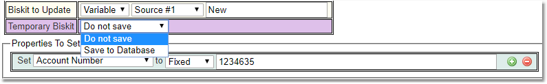 Updates the supplied Biskit with the list of properties to be set and whether the save is temporary or not.