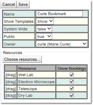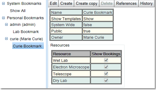 A bookmark holds a list of resources that a user would like to see on the calendar at the same time. This is a quick way for the user to set up their calendar to view the required resources. A user may have many bookmarks to enable different views of the calendar. A user may see their own bookmarks and all system wide bookmarks. When a user creates a bookmark they can make them system wide for other users to use.