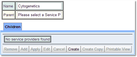 Also once a Service Provider is created the child Service Providers can be created directly using the Create button in the Children tab.