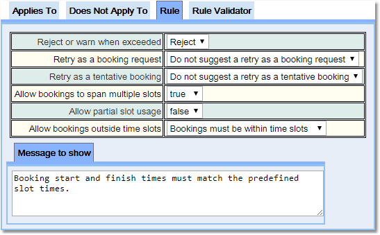 The Predefined Slots Booking Rule allows the administrator to specify the times of the day that bookings must adhere to. This can be used to enforce time slots starting and finishing at particular times. The Booking Rule will also enforce whether bookings may go over multiple time slots or partial time slots may be booked. The time slots for this Booking Rule are set up in the Resource Editor.