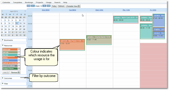 The Resource Usage Calendar shows a calendar much like the Bookings Calendar, except that everything is displayed in the past. That's because resource usage that hasn't happened yet cannot be recorded. The calendar shows usage for any resource and gives the ability to filter that usage as required. If the user has suitable permission, then they can also create and modify resource usage from the calendar. This may be necessary if something prevented usage being recorded as a resource was being used.