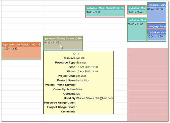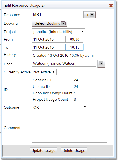 The user may need to create a resource usage record after the fact due to problems at the time, to do this select the time area for the resource usage and the resource usage create pop up will appear Fill in the Resource, Booking, Project and User information. Once the Outcome is chosen the Create Usage button becomes active and can be pressed to create the resource usage information.