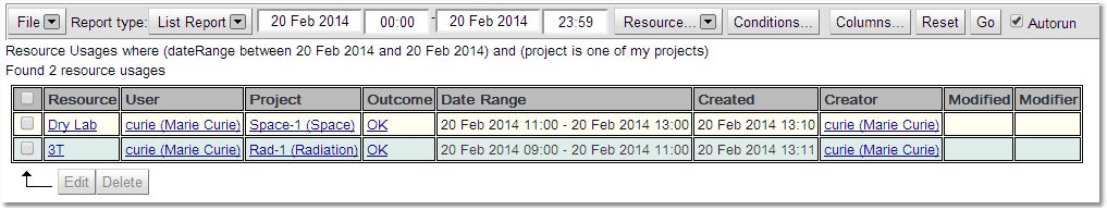This is what the My Projects'Resource Usage page looks like once a search has been done: