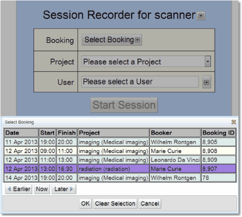 First select the booking to record resource usage for. When selecting a booking, the pop-up Booking Selector will display the bookings the user has permission to access for the current resource around the current date and time. This should make it easy to select the right booking.