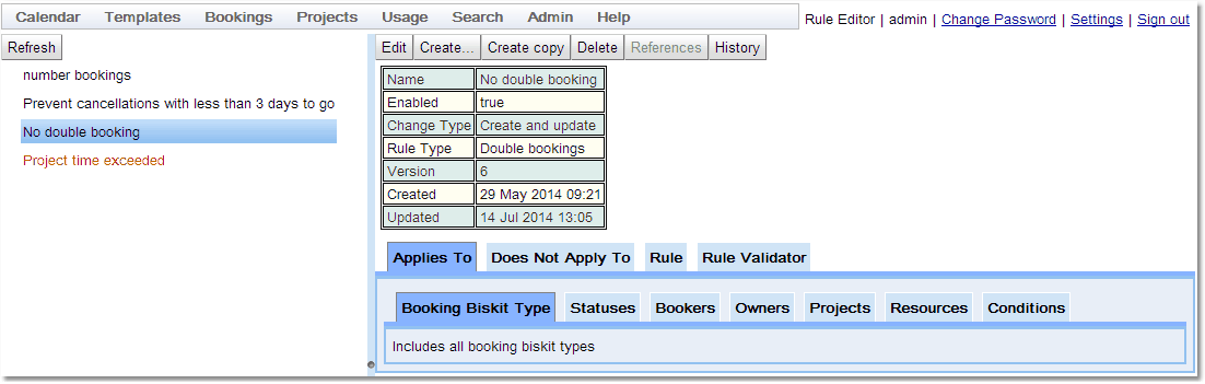 The Booking Rules Editor shows all the Booking Rules and gives the ability to create, update and delete them. By default, it appears on the menu here: