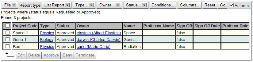 For a more complete explanation on how to edit records in a project search view read the How to Edit Multiple Items At Once section of the Data Explorer chapter. The only difference is in the booking search views as well as Edit and Delete there are also options to Approve, Deny or Terminate multiple projects.