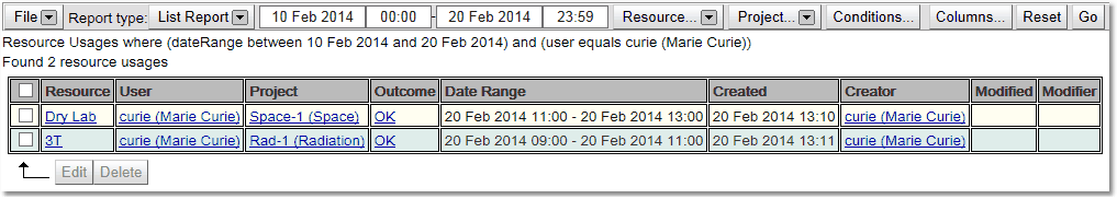 When entered any of the resource usage search pages you will automatically start a search of the appropriate type with a date range of today. This is what a search will look like when it is completed.