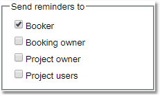 Then choose who gets a reminder email, with the options being: •The person that made the booking. •The person that owns the booking. •The person that owns the booking's project. If there is no project on the booking, then this setting is not shown. •The people associated with the booking's project. If there is no project on the booking, then this setting is not shown.