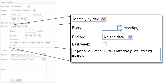 Monthly by day: Repeats each month on a particular day, this could be defined for example as: "Repeat on the 4th Monday of every month"