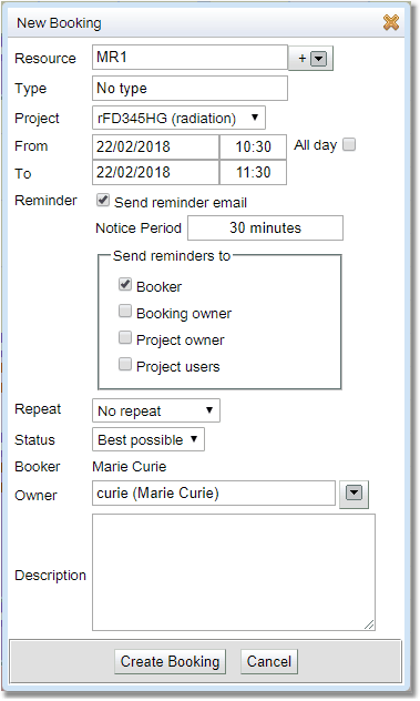 Once all the details have been entered and Create Booking has been pressed, then the new booking will be sent to the Calpendo server. Once there, it will undergo more tests to make sure that the booking is valid. An error message will appear if it is not allowed, a warning message if it is allowed, or the booking will be quietly accepted. Use Cancel to cancel the booking process.