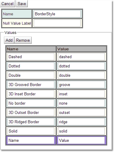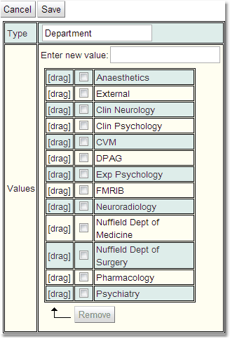 When in edit mode for String Enum Def to add a new value, use the Enter New Value box and press Enter when finished. The new value is added to the bottom of the list. To remove items select the check box for the items to be removed and then press the Remove button. To move an item to a different position in the list use the [drag] column. Select the item to be dragged and then drag and drop it where required.