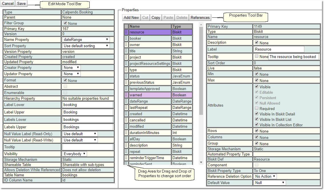 The Bakery Editor allows an Admin user to see, modify, create and delete Biskits and their properties. The Bakery Editor also allows access to any Mapped Integers or Strings, any String and Java Enumeration definitions as well as the unit definitions. To access the Bakery Editor page it can be found at Admin->Bakery. However, the administrator may have configured Calpendo so that the menu is different.