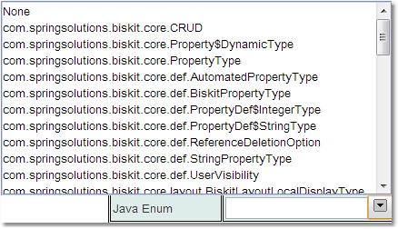 A Java Enum property, as well as the normal settings required by a PropertyDef, must also specify its Java Enum. This indicates which of the Java Enums to be used.