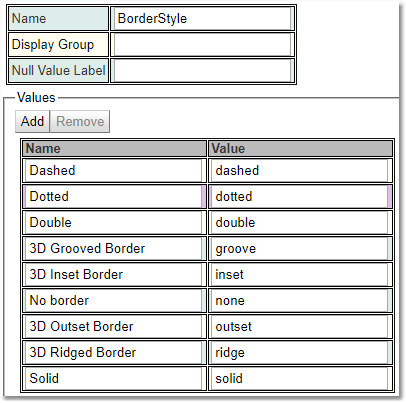 To add new values press the Edit button and then the Add button, the new entry will appear at the bottom, set the name of enumeration and the value to store with that name. Then press Save. Use the Display Group to bring related items together in the same group to make finding them easier.