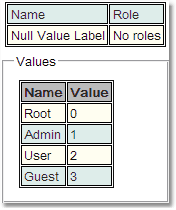 So using the Bit Set bit table a user that has both Admin and User roles would have a value of 6, the 1 and 2 bits set. A Guest user would have the value 8, just the 3 bit set.