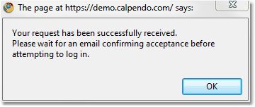 Once this account has been accepted by the administrator of Calpendo then the user will be able to login. This enables administrators to control whom has access to Calpendo.