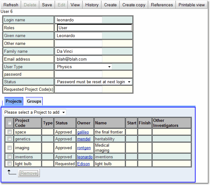Apart from being able to choose the type of data to look at, the Data Explorer page is identical to several other pages in Calpendo, such as the list of users shown in Modifying Users.