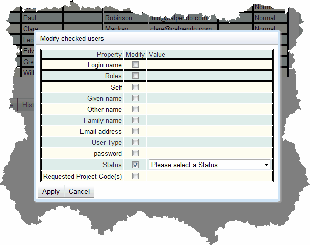 1.Tick the check boxes next to each item to be changed, or tick the box in the header row to tick all boxes.