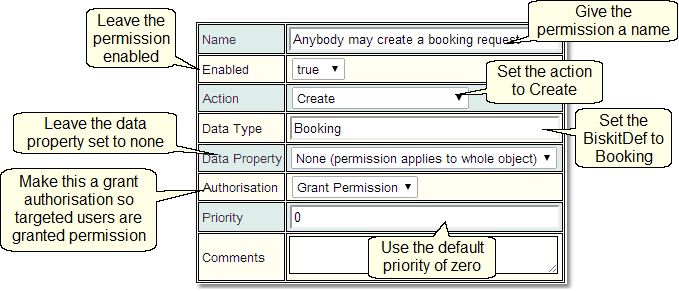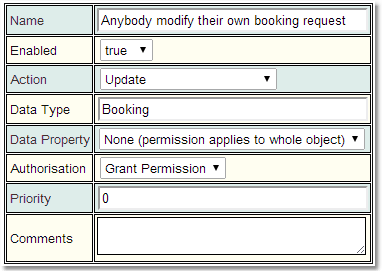 This example will create a Permission that authorises anybody to create a booking when the booking to be created has its status set to Requested. Note that by creating a Permission like this, it doesn't influence what happens when somebody tries to create a booking whose status is set to something other than Requested.
