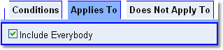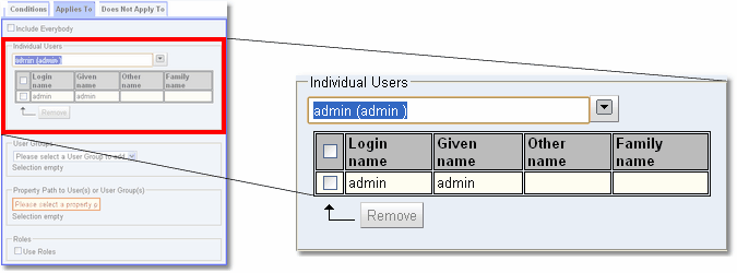 2.On the Applies To tab, untick Include Everybody and under Individual Users, select one or more users. In this example, a user called Admin has been added.