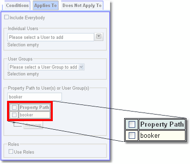 4.We now need to limit the Permission to applying to whomever created the booking. This is easy because each booking stores a record of who booked it in the booker property. To do this, go to the Applies To tab, untick Include Everybody and then add a property path to booker.