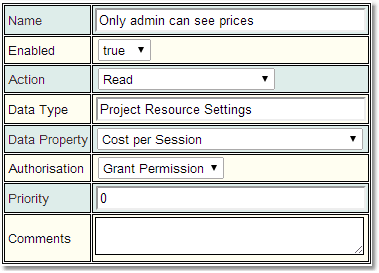 This example protects the Cost Per Session property of a Project Resource Setting, as stored in each project. The idea is that we would like to stop anybody apart from one particular administrator being able to see what the price being charged is. This serves to demonstrate how to protect individual properties and how to apply Permissions to individuals. This is known as a Property Level Permission.