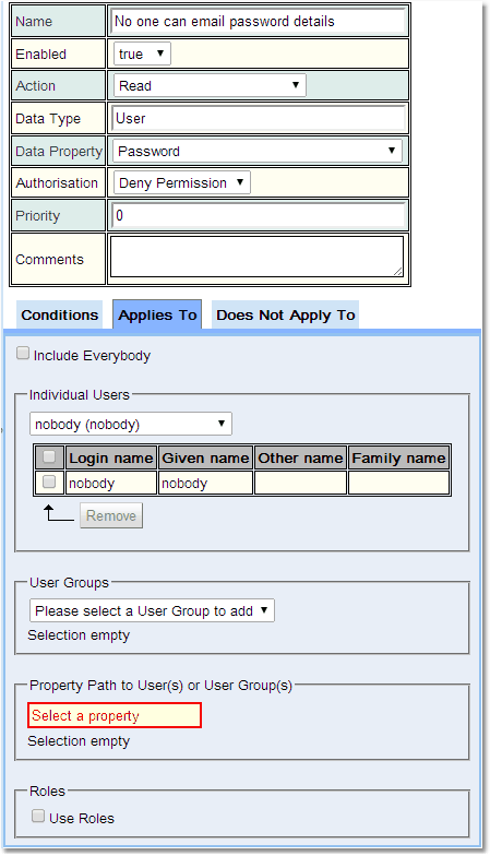 In this example, we are going to create a Permission that stops everybody from putting the value of the password property of the User Biskit Type into an email. To do this we will be using the special user nobody