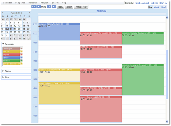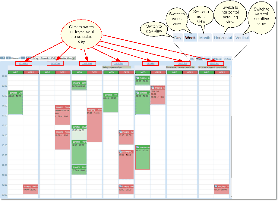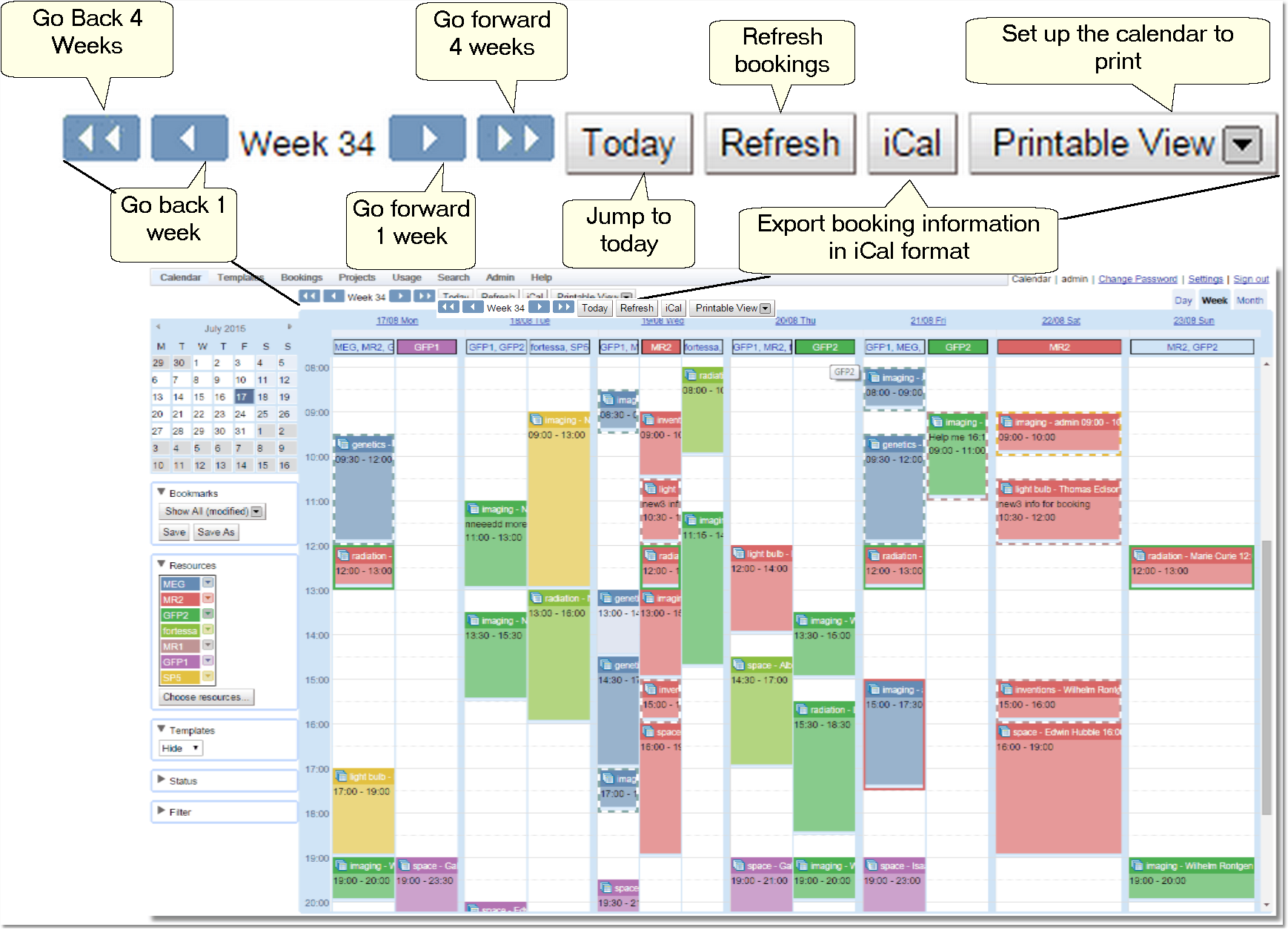 The button bar at the top of the calendar allows movement through time, refreshes the currently displayed bookings, exports iCal information or switches to a view suitable for sending to a printer.