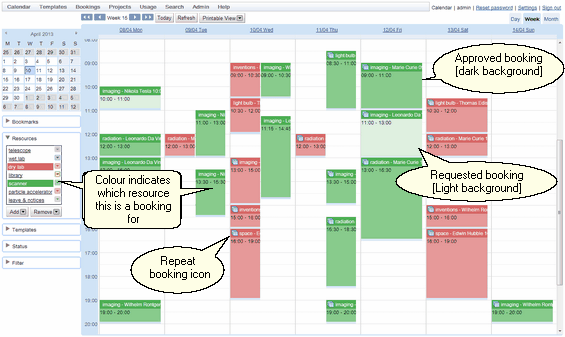 The colours on the Bookings Calendar are used to indicate the resource being booked, and the shade tells you whether a booking is a request or if it has been approved. A dark booking is approved, while a light booking is a request (although if tentative, cancelled or denied bookings are being displayed, they are displayed with stripes, Tentative: green stripes, Canceled: dark stripes, Denied: red stripes). This screen shot shows a week's bookings for two resources, the bookings for one resource in green and the other in red.