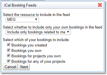 When exporting iCal information the user needs to decide if they want to export information on a single resource or all resources, and whether they want bookings related to themselves or other peoples bookings as well. If they want bookings related to themselves they can also decide which of the relationships they want to choose. Once these options have been chosen a link will appear at the bottom of the booking feed box, copy and paste this link to the calendar application. The frequency of updates to the calendar may be determined by the calendar application itself, if not, it is every hour.