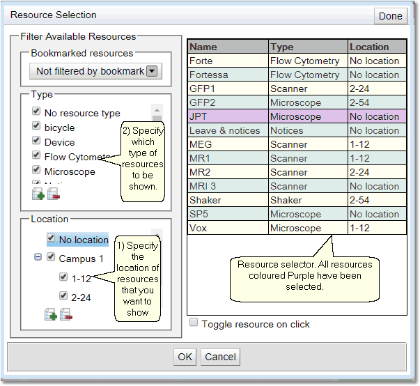 When dealing with a number of resources there will be times when a user will only need to see some of the available resources. The Resource Selection pop-up allows users to determine which resources will be shown.