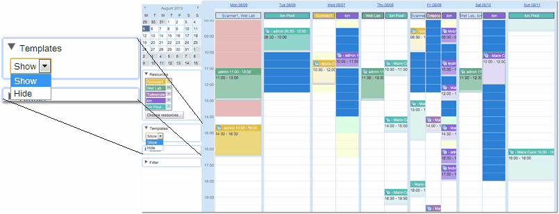 The Time Templates option allows you to decide whether to show or hide basic Time Template information for all resources. This allows the user to quickly see for a resource which Time Templates are being used. Areas in red are either in the past or bookings are not allowed, in yellow, bookings may be requested awaiting acceptance although a warning may be issued, in green when bookings will be automatically accepted or white where no Time Template is present. (The colours are the defaults and may be changed in User Settings. In the example below the Requested colour has been changed to blue to make those areas stand out from the warning areas.). If the calendar shows Time Templates for multiple resources in the same column, then it will show the background colour to represent the most lenient restriction for all the resources it's showing Time Templates for (no Time Template being the least restrictive). Which means if the background is red, then none of the resources displayed in that column can not be booked. If it's white, yellow ( or blue in the example below) or green, then the user will be able to book for at least one of the resources displayed in that column. Moving your cursor over an area where Time Templates are active, for the current user, will provide a tool tip with any message(s) the administrator has defined for the Time Template(s).