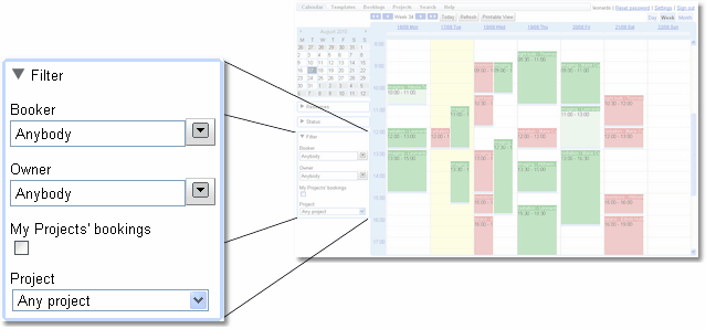Using a filter can restrict which bookings are displayed by selecting who booked or who owns each booking.