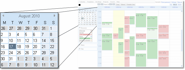 The month navigator quickly changes the date being displayed. Click on any date to display bookings for that date. This will work the same regardless of whether the view is for a day, week or month of bookings. Today's date is shown with a dark background.