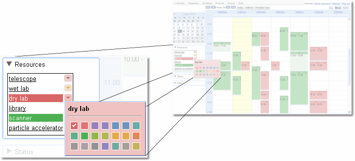 The Resource Selector shows the available resources, which ones are currently selected, and what their colours are. Click on a resources name to make it the only visible resource. Hold the shift or control key down and click on a resource, to also select that resource for viewing. If the background colour is visible, then that resource will be on the calendar.