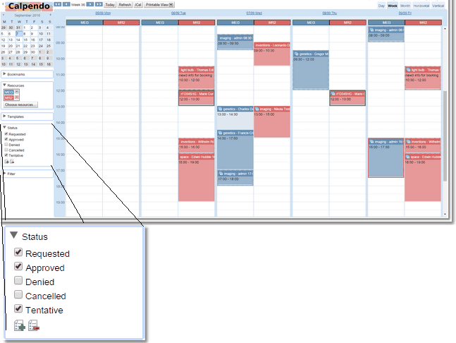 Normally, the bookings calendar displays bookings that are approved, tentative or requested, but ignores denied or cancelled bookings. Click on the Status label, to open up the Status Selector. Here choose the statuses to be displayed.