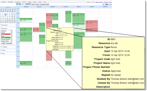 When the mouse hovers over a booking, a tool tip will appear which shows some of the details for the booking. More information can be found by clicking on the booking to get the booking pop-up, but the tool tip shows the most important information. This tool tip information may be configured by the administrator in the Resource Editor.