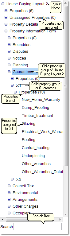 b.Bottom left shows the organisation of the Property Groups and properties for this layout in the form of a tree. (Organisation Pane)