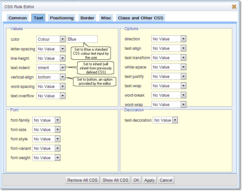 The possible CSS values are organised into different tabs to help with finding the required CSS value. When the drop down button is pressed for a value the user will have a choice of options. Some will require the user to input the appropriate CSS string (see Colour above). The user can also specify inherit which means the CSS will be inherited from previously defined CSS by the user, this could be in Global Preferences or elsewhere in Calpendo where CSS can be defined.