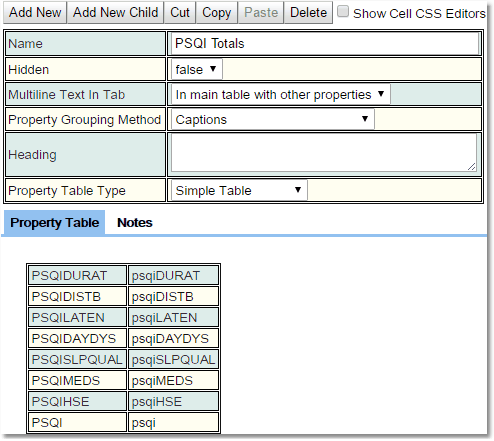 If a Property Group is selected then information about that group is displayed. Any properties associated with the Property Group are listed under the Property Table tab showing their Name and Label. The Notes tab allows the user to define whether this Property Group contains a Notes field and/or a . The Copy button allows the user put a copy of this Property Group into the buffer for later pasting. |