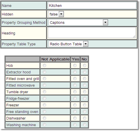 The properties contained within a Property Group may also be organised in one of four ways, Simple Table, Multi Column Table, Radio Button Table and Custom HTML.