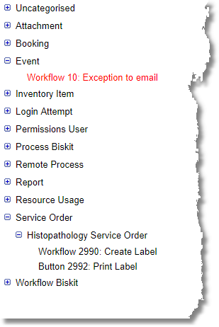Once all the items in the tree are viewable, the Workflows in their Main Type categorisation will be seen, with any that are disabled shown in red.