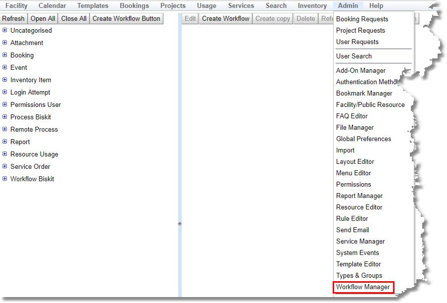 The Workflow Editor shows all the Workflows and allows creating, updating and deleting them. By default, it appears on the menu here: