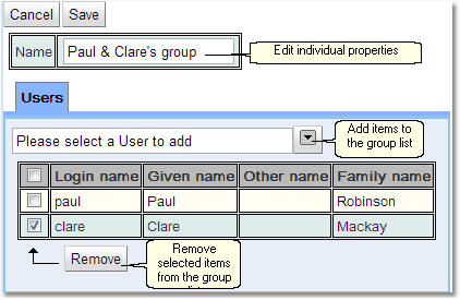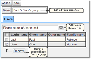 Once in edit mode, edit any properties with permission to access and add or delete items from group lists.