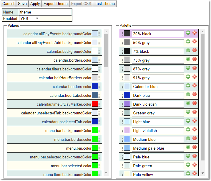 Give the Theme a name, set the colours required for each of the elements and adjust the palette if required. Click Save and the theme will be available for selection in both the Global and User settings areas. Adjusting the pallette is a quick way to change the colour for all options that use it.