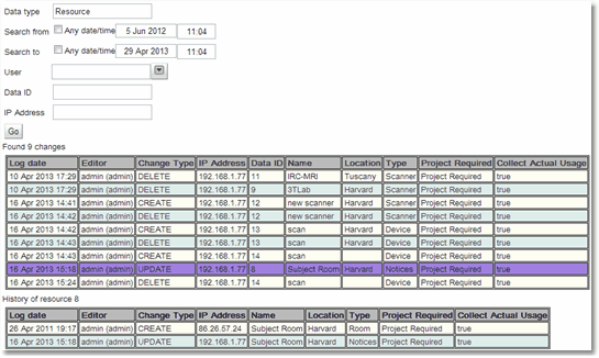 After pressing Go, a list of matching changes is displayed. Each one will represent a change to something within Exprodo DB. When the list appears, click on one of them to see all changes to the same Biskit. For example, if the search was for changes to resources made on a particular day, returned will be a list of changes that affected all the resources on that day. By clicking on one of them, the user would then see all changes made to that resource, regardless of when that change was made.