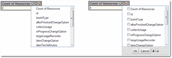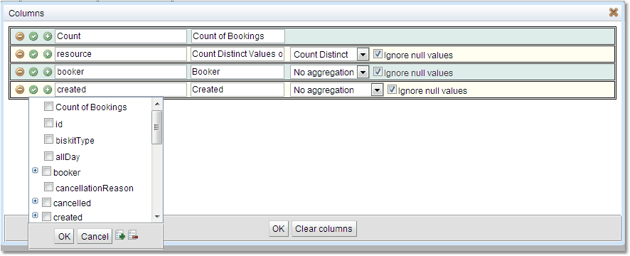 If the Columns... button is clicked a pop up appears, in which the columns can be chosen using the same three buttons as described above. At the same time the user can decide what aggregation to use, No aggregation or Count Distinct, as well as whether to Ignore null values.