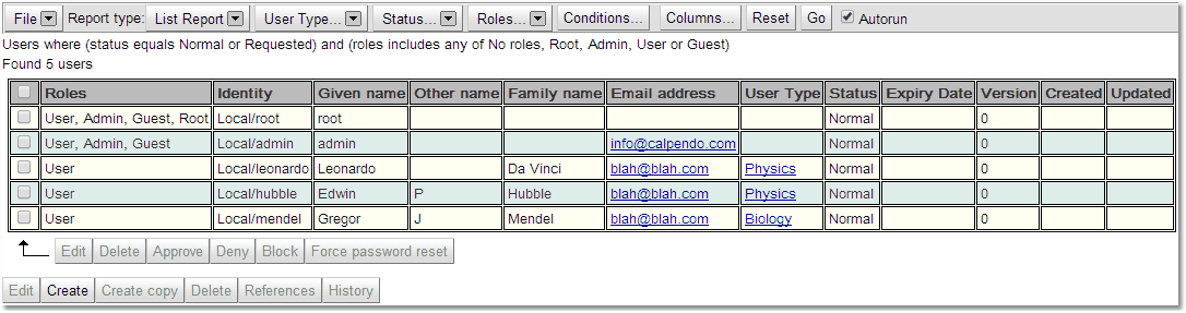 To add a new user that has not been requested go to the User Search page. There will be a list of the current users and underneath a menu bar with Create button enabled.