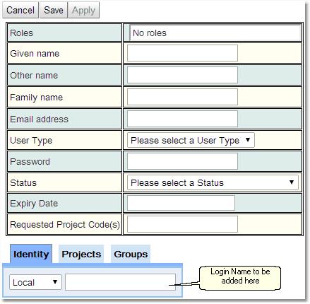 In order to understand more about the properties used for a user read the section on User Properties. The login name to be used will be added under identity after choosing the appropriate authentication method. Also in order to understand more about setting up projects and groups for a user read the section on The User Requests Page and Modifying Users.