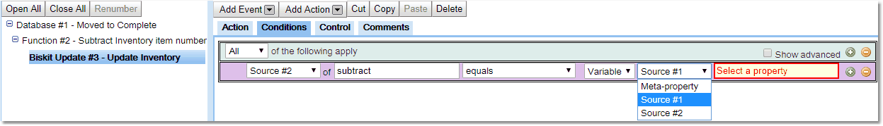 Workflow Actions can access information on all their ancestor actions and the Event that triggers that section of the Workflow. To do this choose which Event/Action will be the Source for the Condition, and then the appropriate list of Properties will be displayed for that Source. This allows the Condition to compare information from different Actions/Events.
